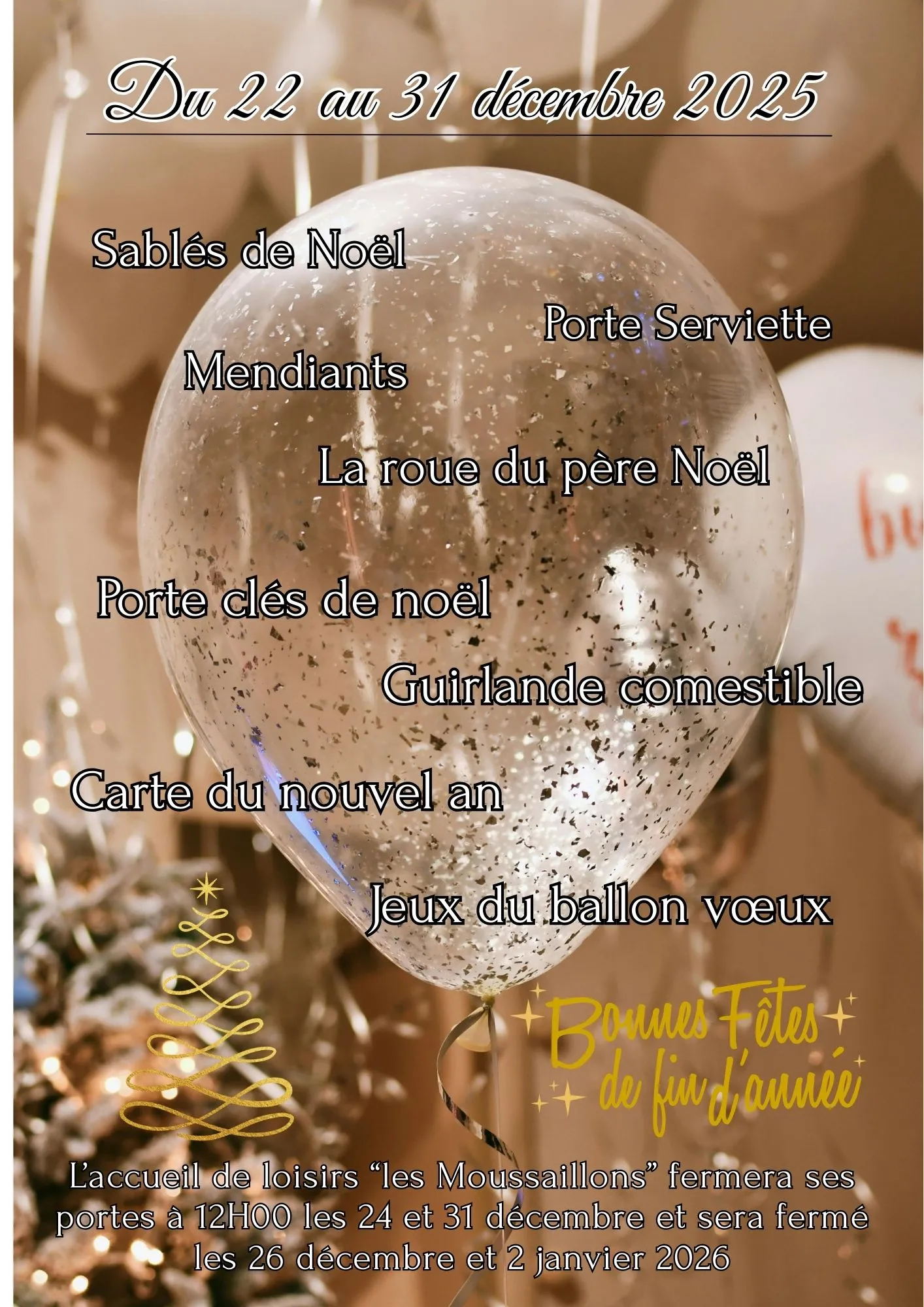 L’accueil de loisirs « les Moussaillons » fermera ses portes à 12h les 24 et 31 décembre et sera fermé les 26 décembre et 2 janvier 2026.